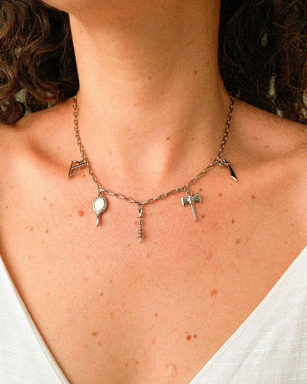 Todos os componentes – corrente, fecho e pingentes – são confeccionados em liga metálica zamac com banho de verniz italiano, garantindo acabamento resistente, durabilidade e brilho sofisticado. A peça possui 35 cm de diâmetro e conta com fecho lagosta e corrente extensora de 7 cm, proporcionando ajuste confortável.
