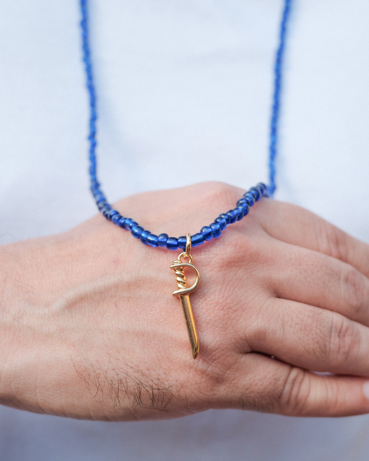 A peça é confeccionada com miçangas de vidro azuis com acabamento vidrado, montadas de forma uniforme, proporcionando maior brilho e intensidade na cor. O destaque está no pingente em zamac no formato de alfange, com acabamento dourado e aplicação de verniz, contribuindo para maior durabilidade da peça. O fecho tipo lagosta garante segurança e praticidade no uso.