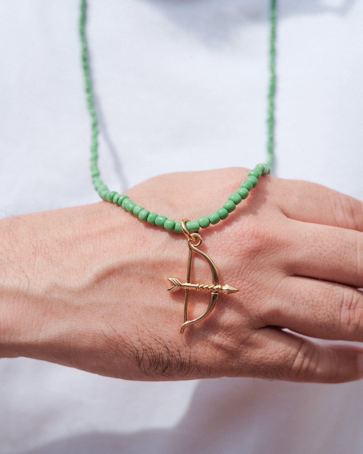 O Colar de Miçangas de Oxóssi é uma peça desenvolvida com referência aos usos tradicionais presentes nas religiões afro-brasileiras. Produzido com miçangas de vidro na cor verde e finalizado com pingente em formato de ofá (arco), o colar expressa uma composição equilibrada entre simbologia e acabamento.