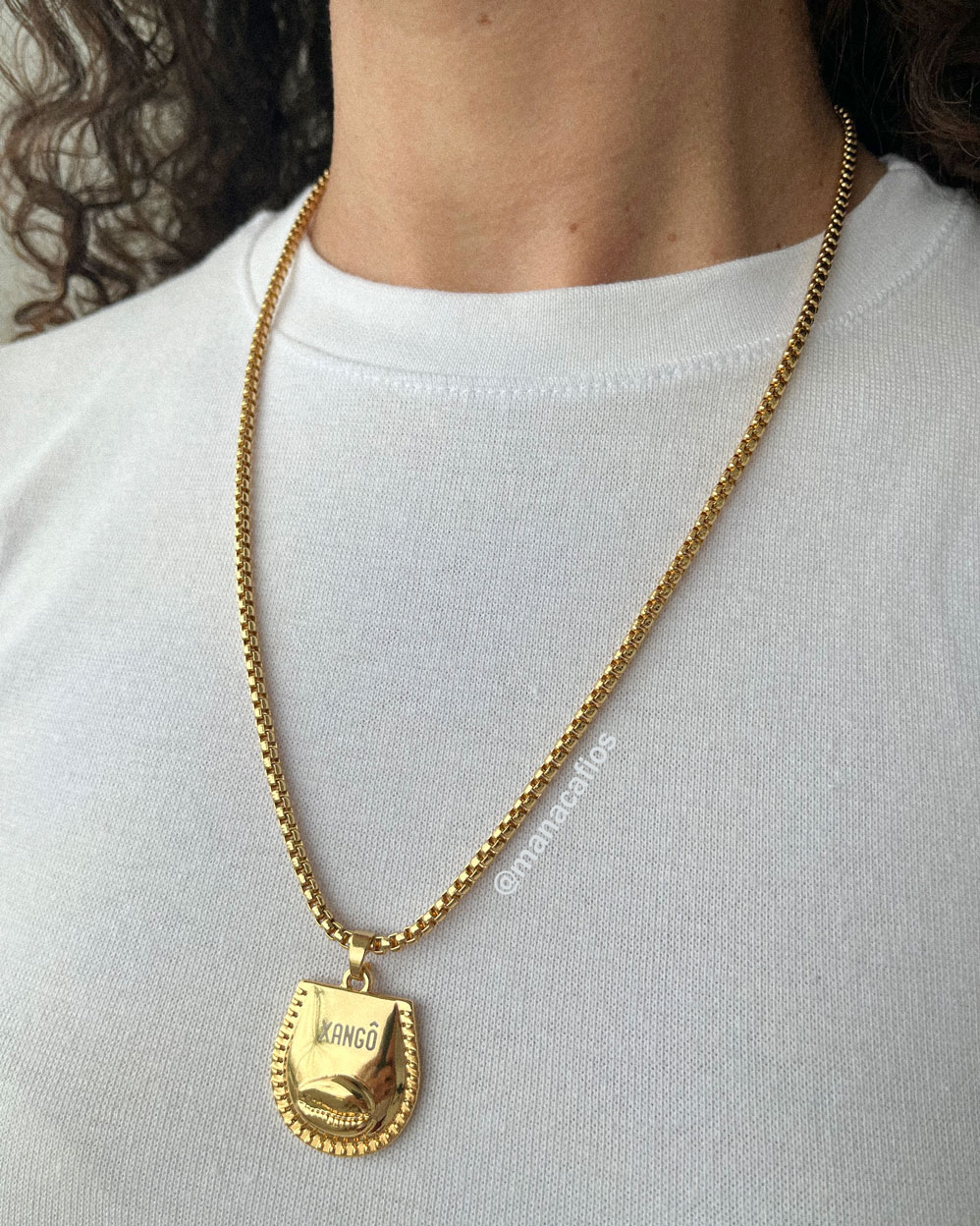 A corrente possui o banho Dourado (cor associada à realeza de Xangô) e um design elegante, sendo perfeita para uso diário. O comprimento da corrente veneziano é ajustável, garantindo conforto e caimento perfeito.