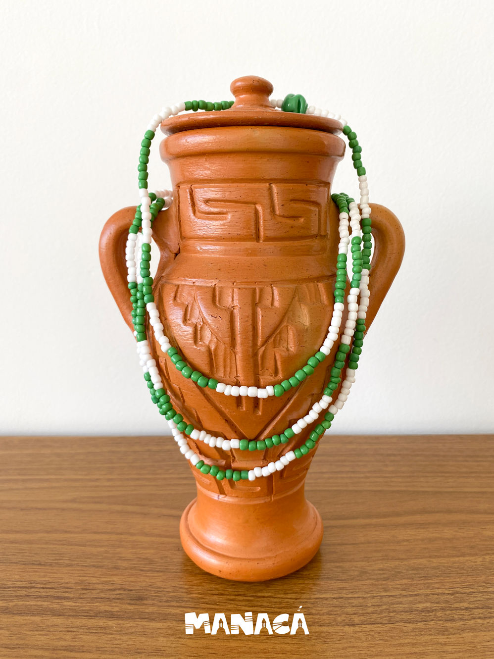 Guia artesanal, produzida na Bahia, berço das tradições afro-brasileiras. Confeccionada com materiais de alta qualidade, como miçangas de vidro, firma de murano e fechamento invisível, proporcionando resistência e autenticidade.
