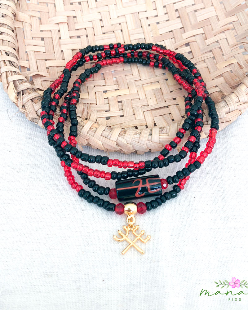 Este é um fio de conta tradicional, confeccionado com miçangas de vidro nas cores vermelha e preta, finalizado com firma em murano e pingente modelo tridente duplo, seguindo o uso nas religiões de Matriz Africana.