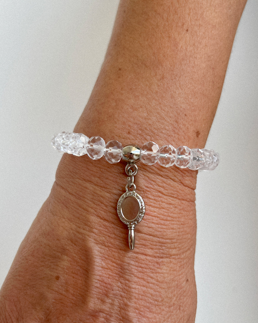 Esta pulseira em Cristal Transparente de 8mm representa a clareza e a paz espiritual. Uma peça curinga e sofisticada, que reflete a luz e combina com absolutamente tudo, mantendo sua conexão com a Rainha do Mar discreta e elegante.